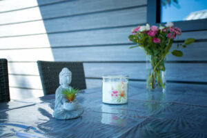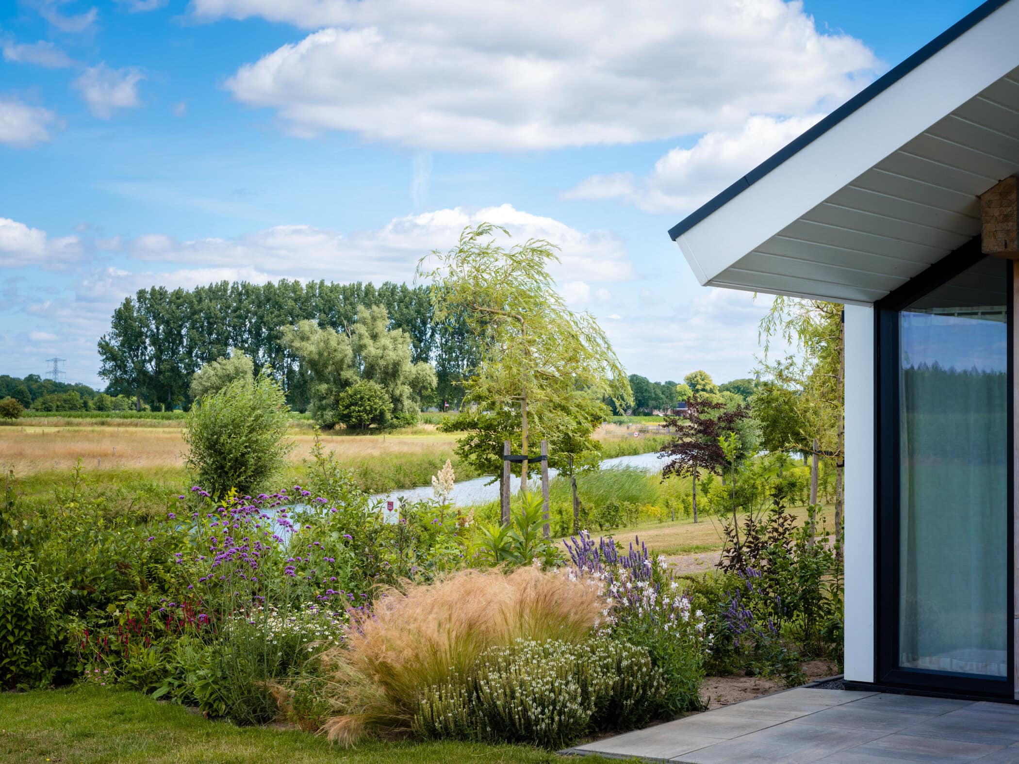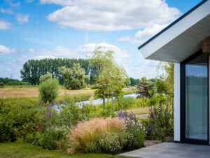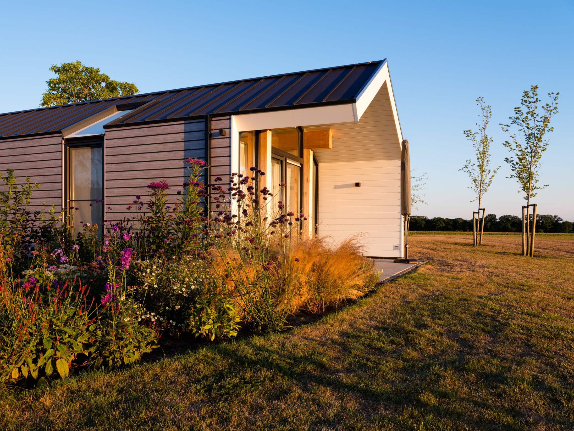 De eco-woningen liggen aan de rand van de camping. De tuin vol met prachtige bloemen loopt zo over in het weidse Achterhoekse coulisselandschap. Wat een rust en ruimte! Daarnaast heeft de eco-woning 2 overdekte terrassen, zodat je altijd lekker buiten kunt zitten.