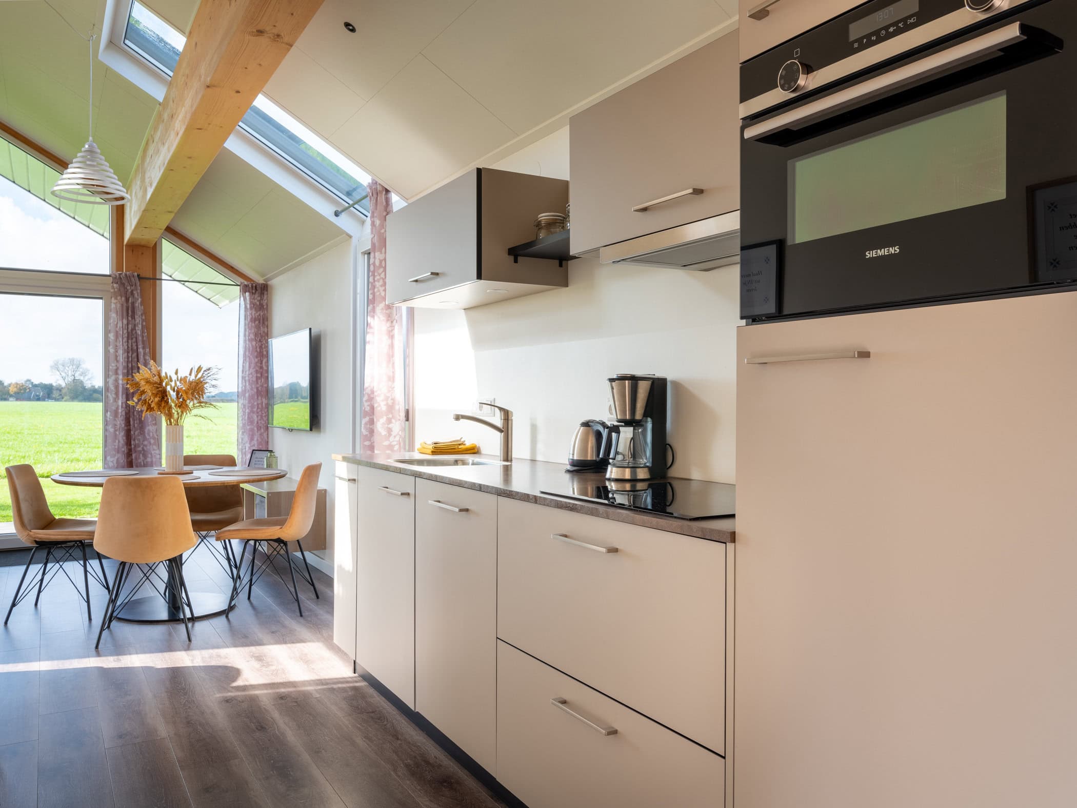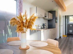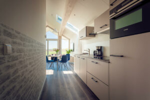Alle eco-woningen hebben een grote, moderne en volledig uitgeruste keuken. Je vindt er een vierpits inductiekookplaat, een magnetronoven, een koelkast met een vriesvakje, een koffiezetapparaat en een waterkoker. Uiteraard bevat de keuken ook pannen en kookgerei.