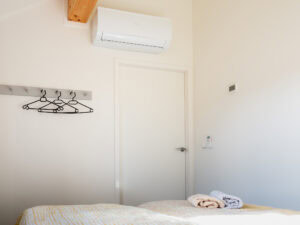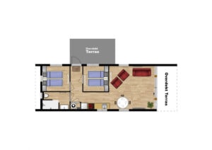 In de gelijkvloerse eco-woning zijn 2 ruime slaapkamers. In elke slaapkamer vind je 2 éénpersoonsbedden. In totaal zijn er 4 slaapplaatsen. De slaapvertrekken zijn voorzien van horren, zodat je geen last hebt van vervelende muggen. Ook heeft elke slaapkamer airco.