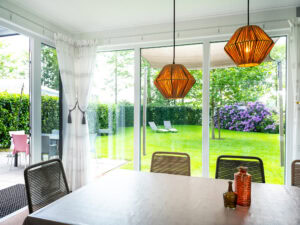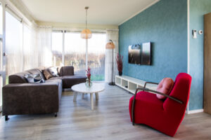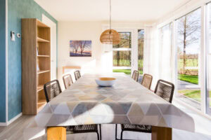 De lichte en ruime woonkamer is ingericht met een grote, comfortabele hoekbank. Hier kun je ontspannen tv kijken of heerlijk een boek lezen. Ook vind je in de woonkamer een grote tafel, waar je lekker met het hele gezin kunt eten of spelletjes spelen.