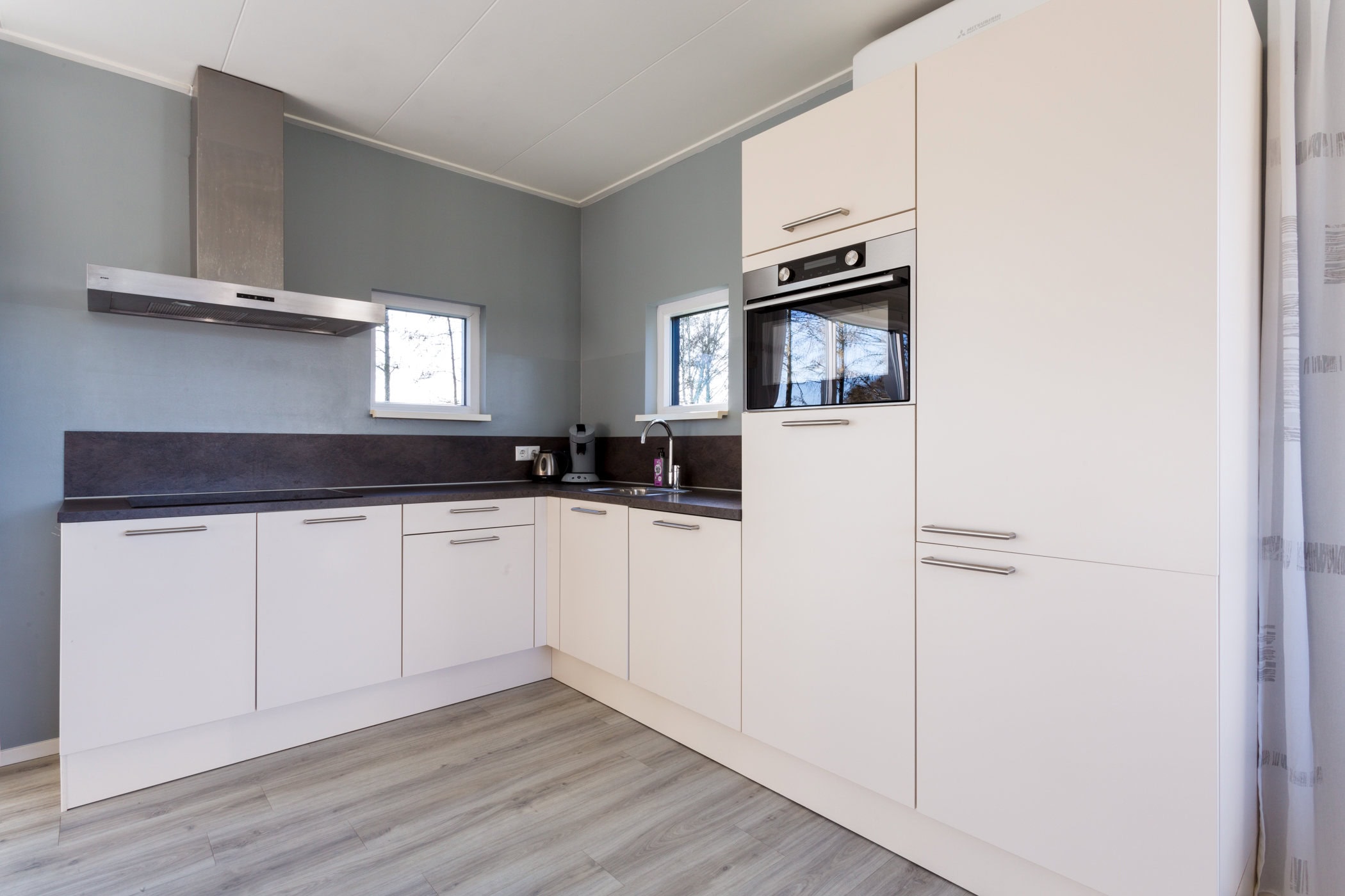 In de andere hoek van de kamer vind je een geheel ingerichte keuken met vaatwasser, een vierpits inductiekookplaat, een ovenmagnetron en een koelkast met een vriesvakje. Koken voelt in deze ruime, moderne keuken óók als vakantie.